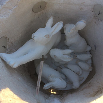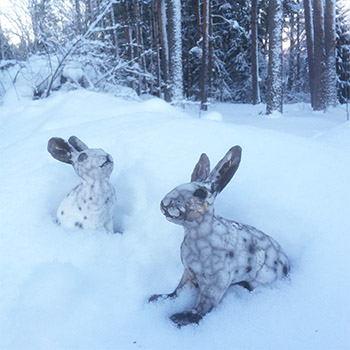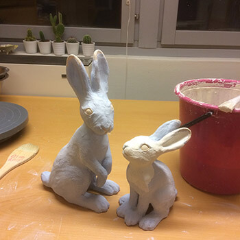 Pikkuinen kuutti saa perusteellista hierontaa. Kiillotan veistokset Perusta ostetulla sydämenmuotoisella kivellä nahkakuivassa vaiheessa, eli veistos on jähmettynyt muotoonsa, mutta pinta on vielä kostea ja muokattavissa. Norpat ovat syntyneet matalapolttoisesta rakusavesta ja ovat sisältä onttoja. Pinta kiillotetaan, jotta lasite lähtisi helpommin pois viimeistelyvaiheessa. Kiillottamisen jälkeen norpat odottelevat kuivumistaan ja raakapolttoon pääsyä.