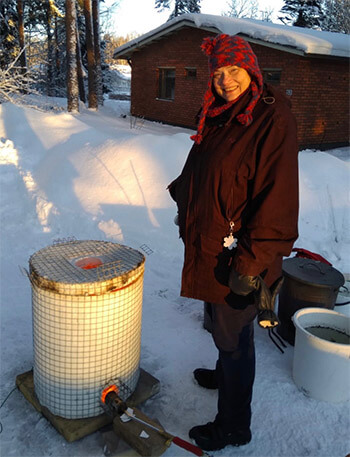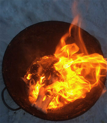 Kun uunin lämpötila on noin 1000 astetta, punahehkuiset puput ja norpat nostetaan pihdeillä savustuspönttöön. Sekaan heitellään lisää purua ja laitetaan kansi päälle. Lasite säröilee ja savu maalaa kuvioita esineiden pintaan. Kun kansi avataan seuraavaa veistosta varten, täytyy olla varovainen, koska liekit leimahtavat korkealle.